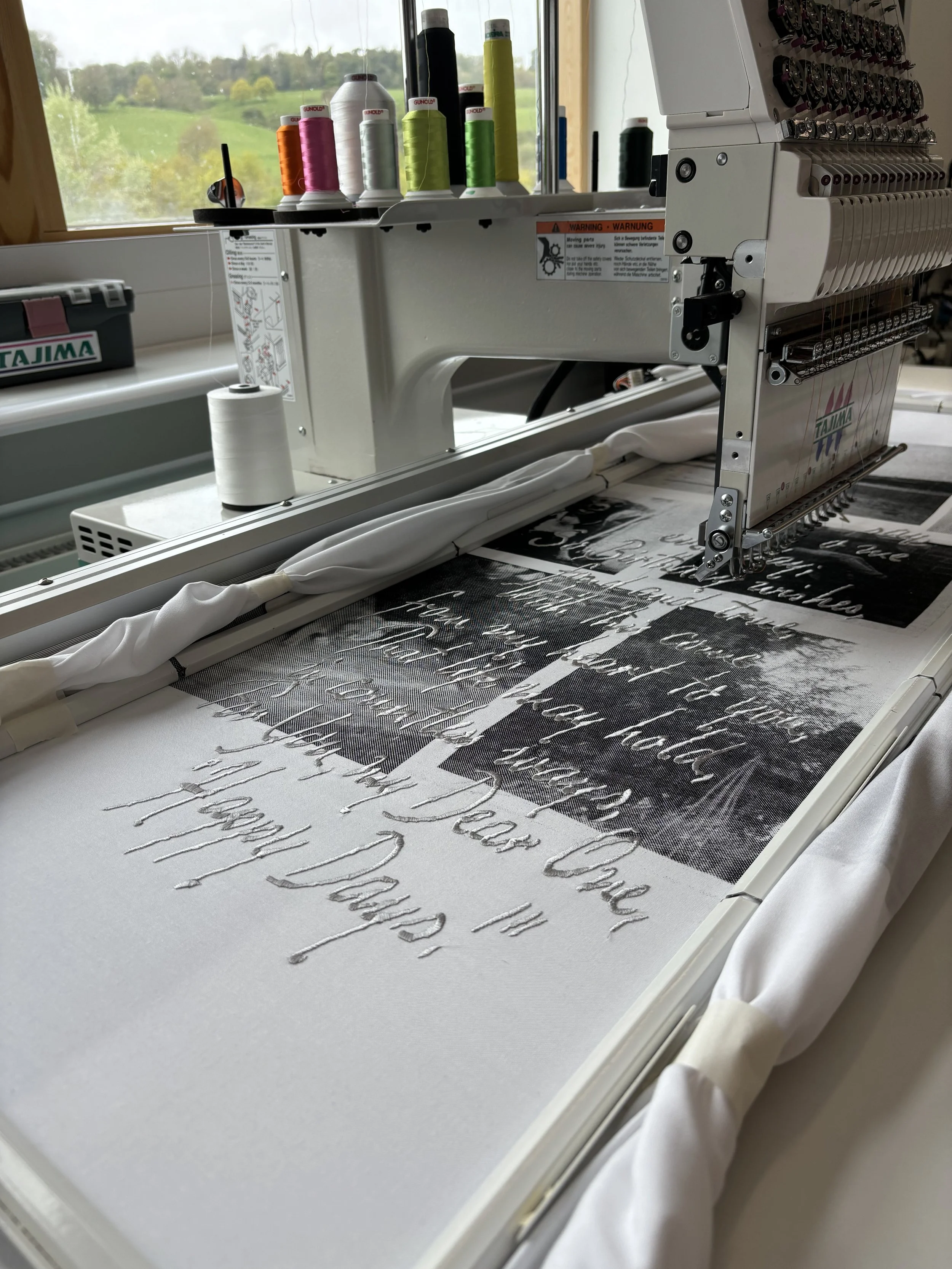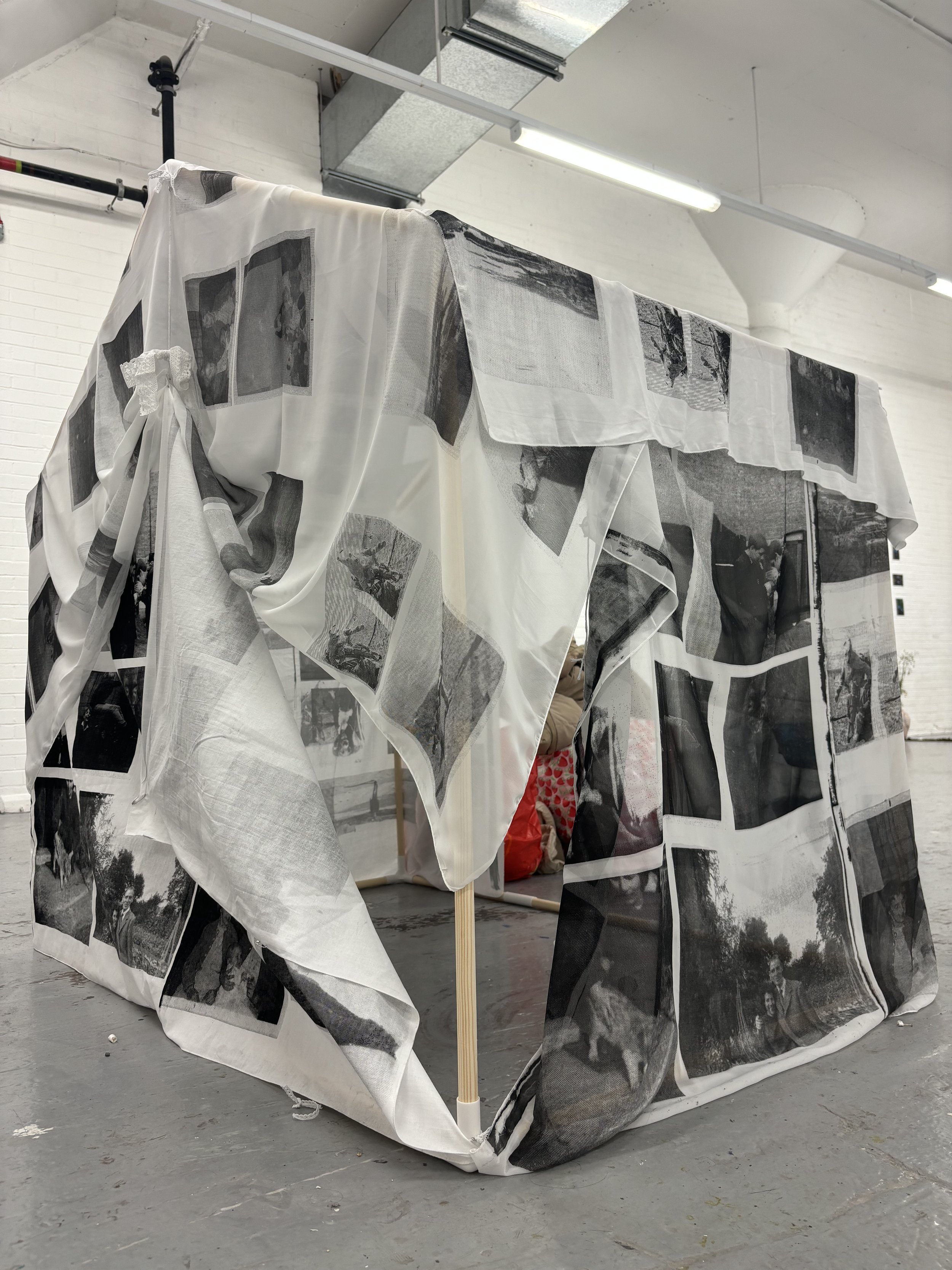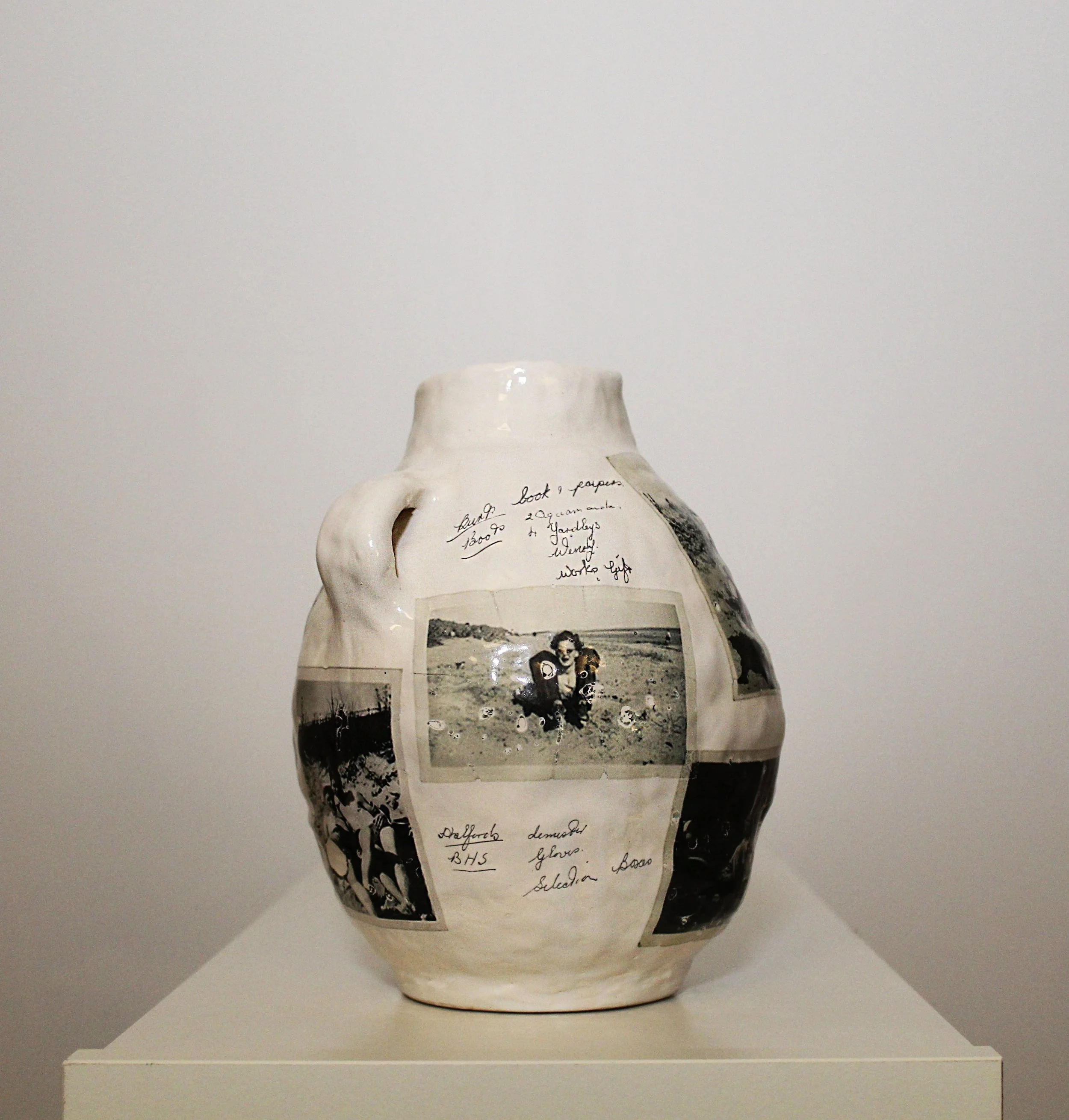 Shelter is an installation comprised of two bodies of work: Family Vessels, a collection of slip-cast vessels, and a series of hand-printed and embroidered tapestry works supported by a wooden frame in the shape of a house. Family Vessels acts as a physical representation of family and, in turn, how this informs identity. The tapestry works serve as a fabric that envelops the house to create a home, exploring how this can be both a comforting and suffocating presence in one’s life; yet a necessary shelter.