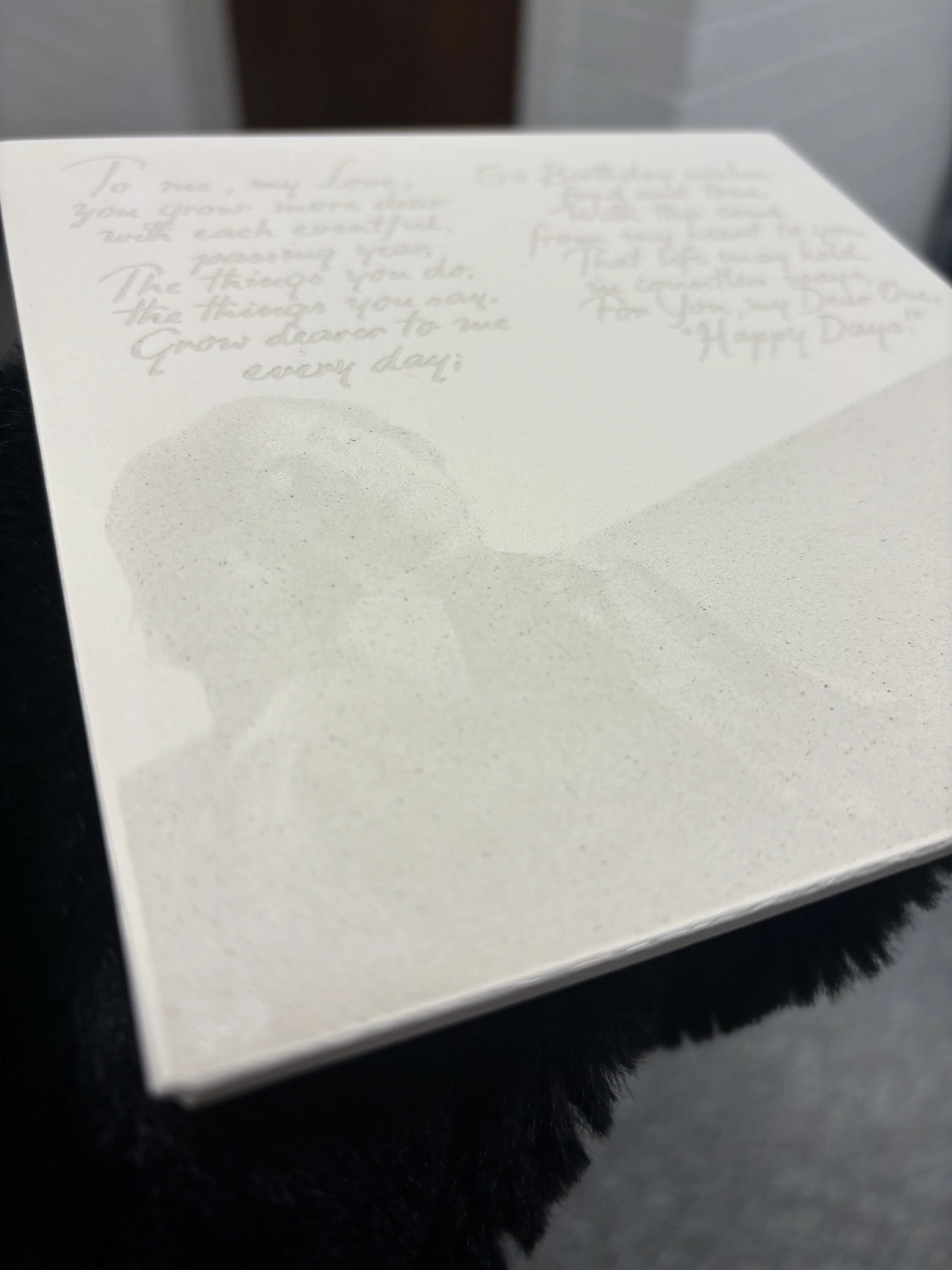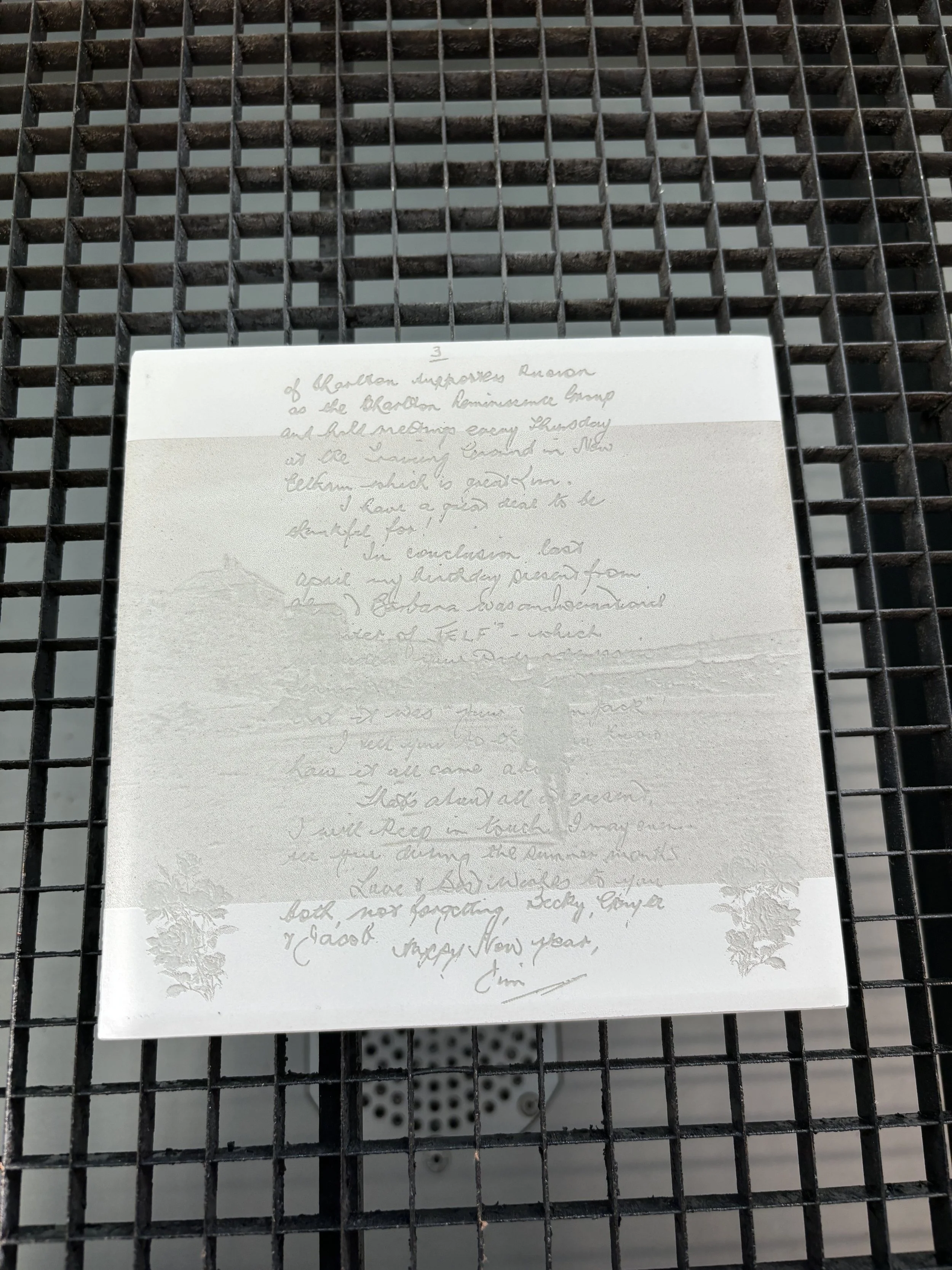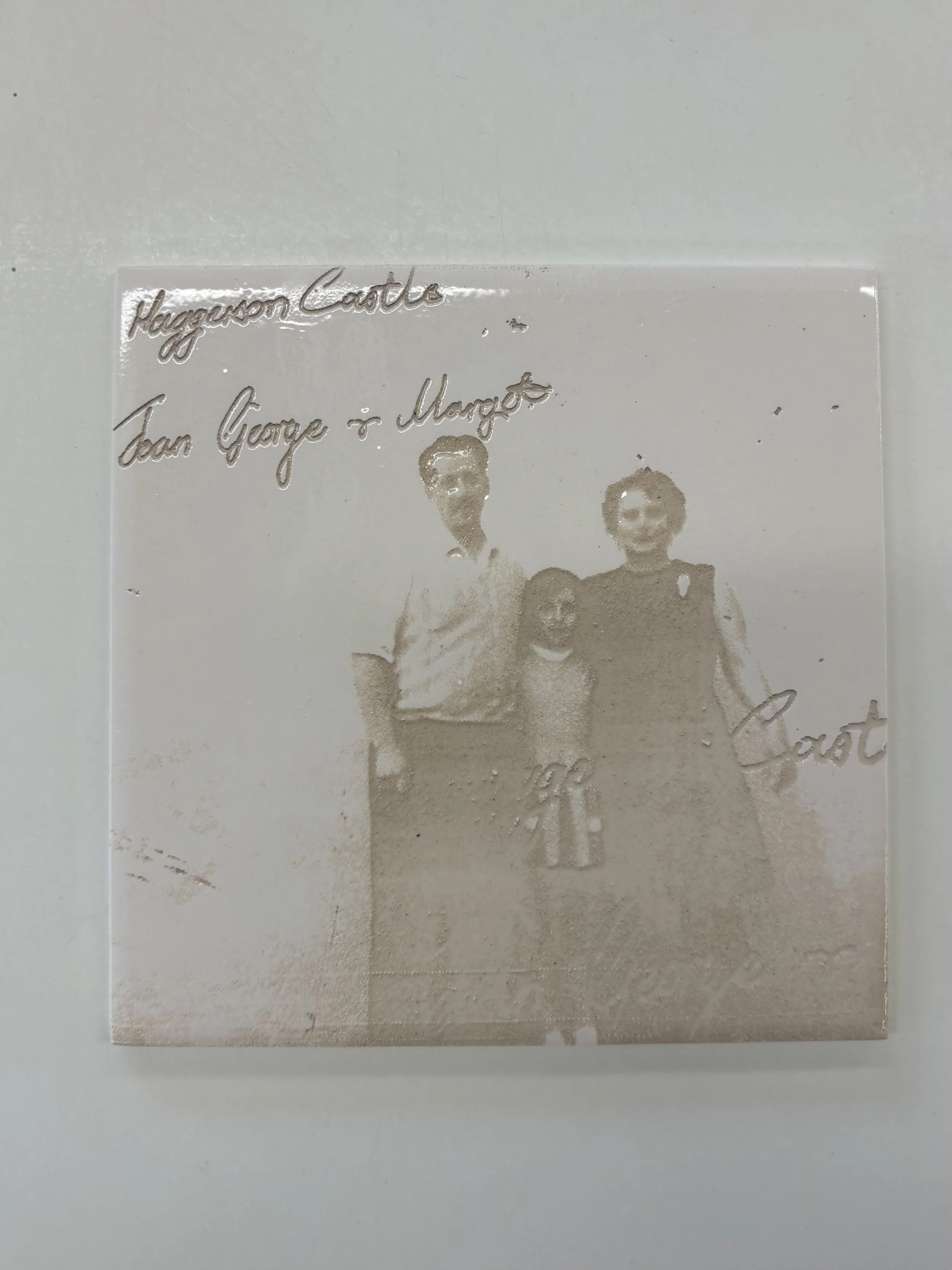 A series of engraved ceramic tiles finished with a transparent glaze, informed by feelings of nostalgia and homesickness. The work uses tone and texture to explore the effect of the passage of time across family lineages, and the translucent nature of both memory and personal relationships. These Tiles serve as a reliquary of family history, taking imagery from an archive of family photographs, postcards, letters, and birthday cards, transforming them into objects of endurance.